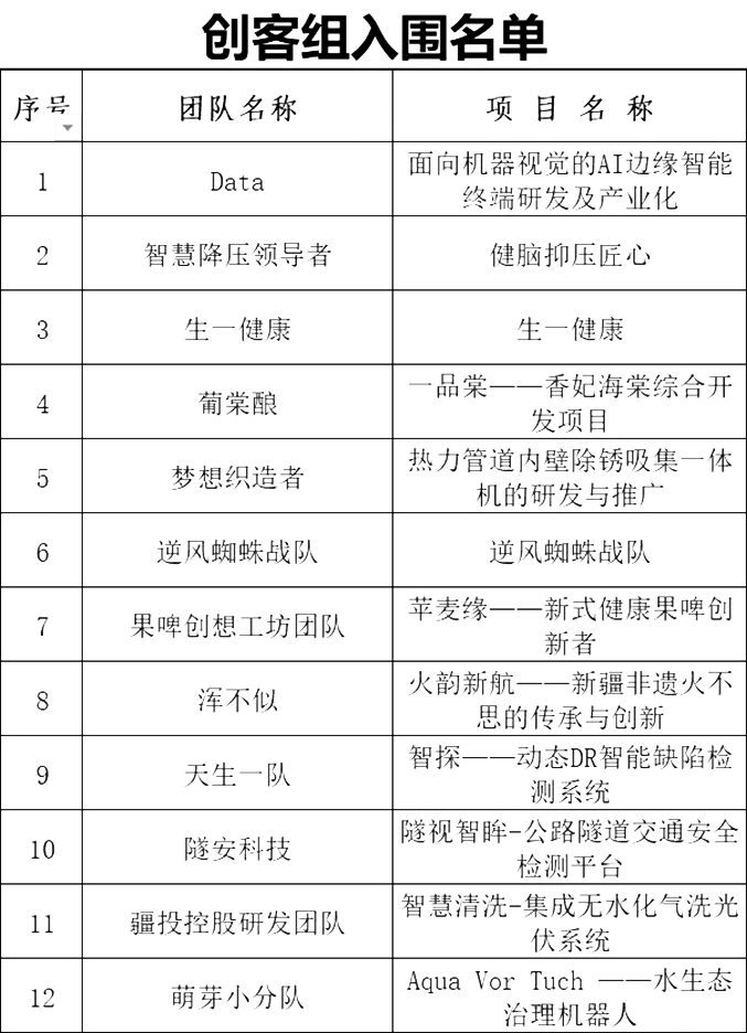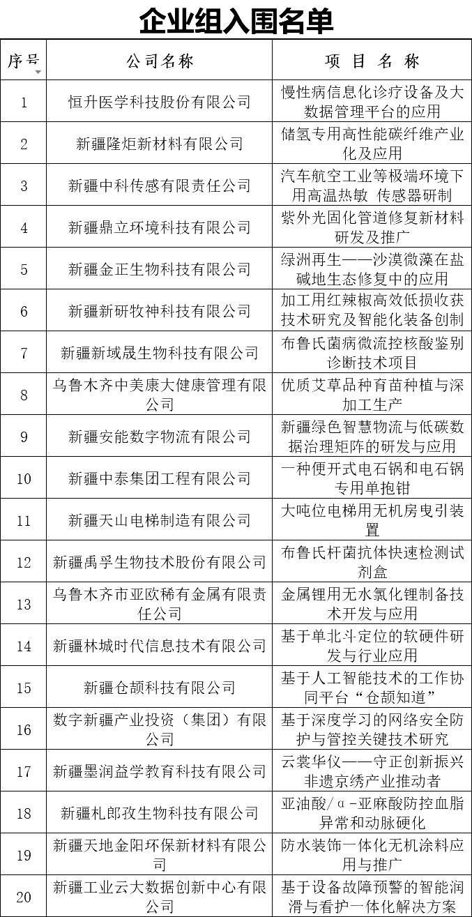 第九屆“創(chuàng)客中國(guó)”新疆維吾爾自治區(qū)中小企業(yè)創(chuàng)新創(chuàng)業(yè)大賽入圍烏魯木齊市選拔賽名單