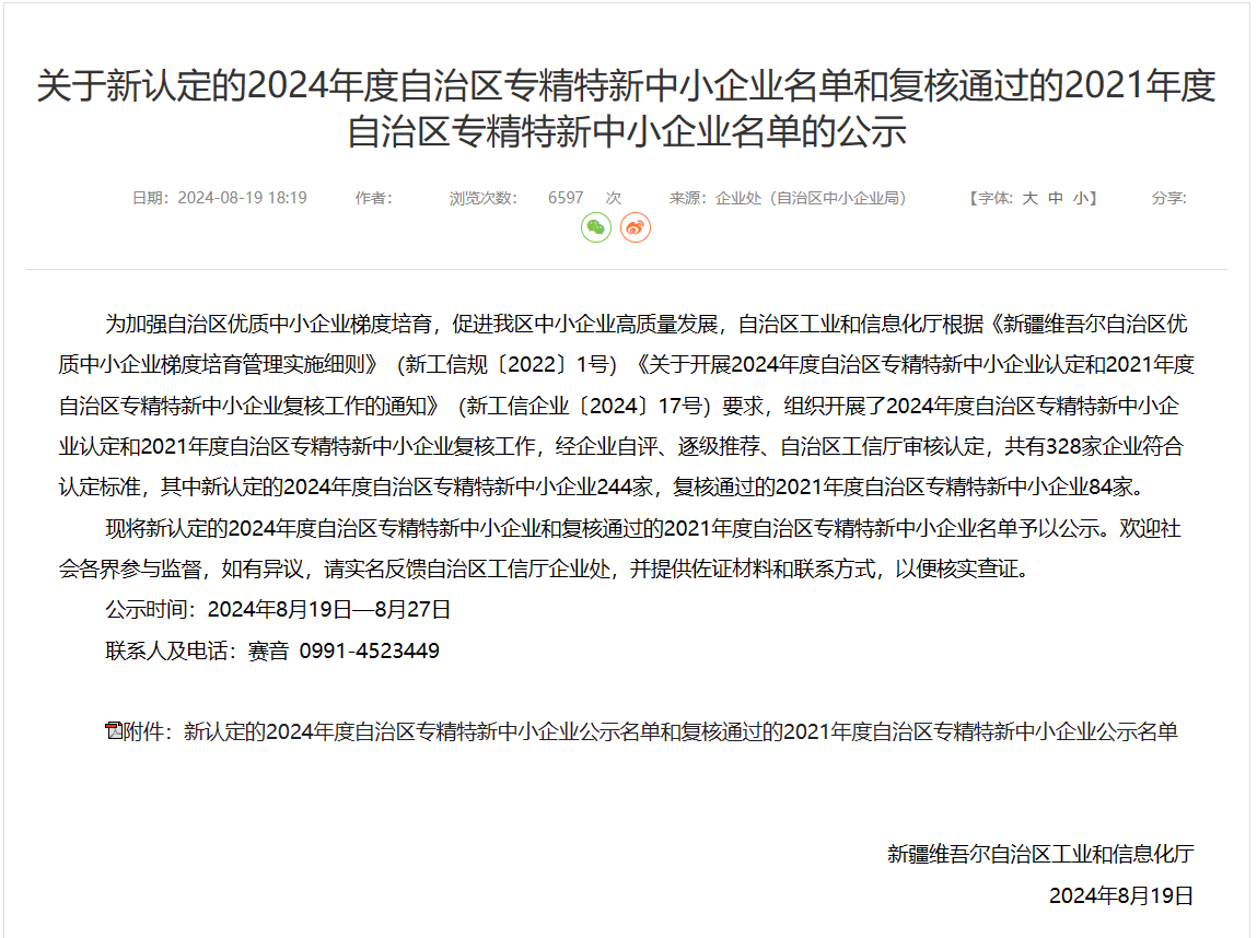 自治區(qū)工業(yè)和信息化廳根據(jù)《新疆維吾爾自治區(qū)優(yōu)質(zhì)中小企業(yè)梯度培育管理實施細(xì)則》(新工信規(guī)〔2022〕1號)《關(guān)于開展2024年度自治區(qū)專精特新中小企業(yè)認(rèn)定和2021年度自治區(qū)專精特新中小企業(yè)復(fù)核工作的通知》(新工信企業(yè)〔2024〕17號)要求,經(jīng)企業(yè)自評、逐級推薦、自治區(qū)工信廳審核認(rèn)定,共有328家企業(yè)符合認(rèn)定標(biāo)準(zhǔn),其中新認(rèn)定的2024年度自治區(qū)專精特新中小企業(yè)244家,復(fù)核通過的2021年度自治區(qū)專精特新中小企業(yè)84家。恒升醫(yī)學(xué)位列其中。