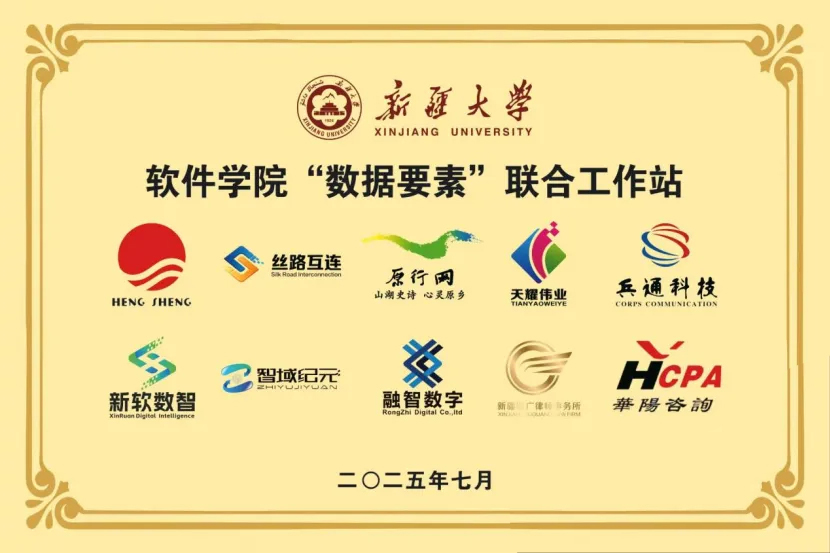2025年7月11日來自新疆大學(xué)軟件學(xué)院、新疆原行網(wǎng)智慧文旅有限公司、新疆生產(chǎn)建設(shè)兵團通信科技中心有限公司、新疆絲路互連數(shù)字產(chǎn)業(yè)發(fā)展有限公司、新疆智域紀(jì)元科技有限公司、新疆融智數(shù)字經(jīng)濟產(chǎn)業(yè)發(fā)展有限公司、烏魯木齊天耀偉業(yè)信息技術(shù)服務(wù)有限公司、恒升醫(yī)學(xué)科技股份有限公司、新疆新軟數(shù)智科技有限公司、天山農(nóng)商銀行、新疆華陽有限責(zé)任會計師事務(wù)、新疆聚廣律師事務(wù)所等單位負(fù)責(zé)人,共同為新疆大學(xué)軟件學(xué)院“數(shù)據(jù)要素聯(lián)合工作站”成立揭牌。